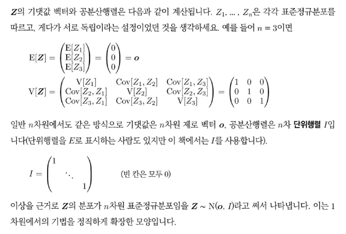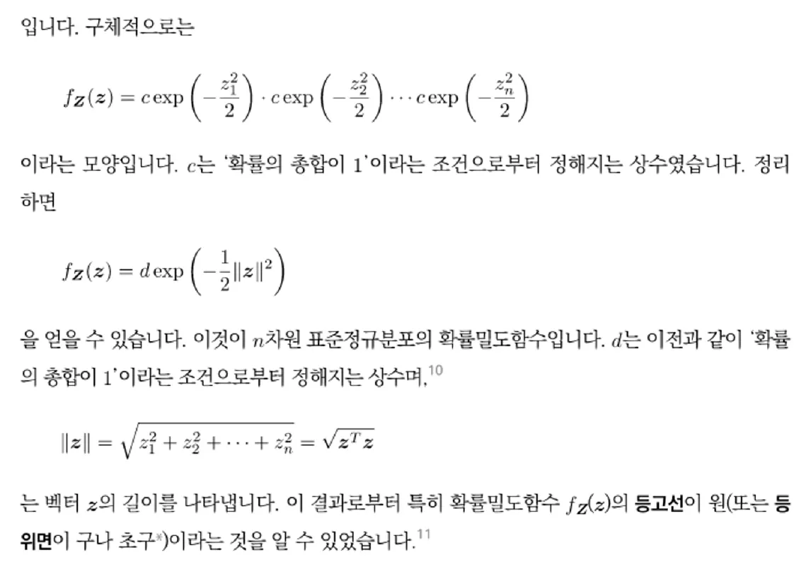 표준정규분포를 따르는 i.i.d. 한 확률변수들 의 열벡터 → 가 따르는 분포를 n차원 표준정규분포, 는 차원(열벡터)